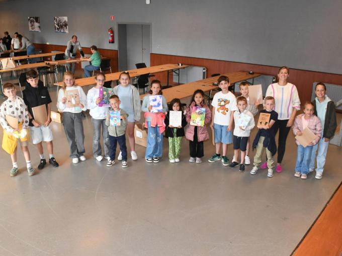 In oc Den Tap in Langemark vond bij de start van het nieuwe schooljaar de boekenkaftdag plaats. Maar liefst 97 kinderen daagden op om hun schoolboeken te laten voorzien van een creatieve kaft. Illustratoren Louise De Meester, Lore Vangheluwe en Gregory Vergote, die in laatste instantie een andere illustrator moest vervangen, verzorgden de tekeningen. “We zijn heel tevreden met de inzet en creativiteit van alle medewerkers”, aldus bibliothecaris Yanaika Lannoo. Op de foto zien we Yanaika met een deel van de aanwezige kinderen en hun gekafte boeken. (foto RB)