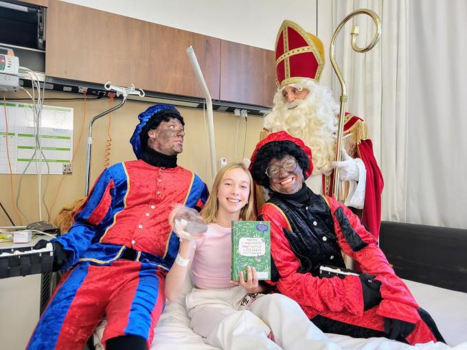 Alona moet haar verlanglijstje nog maken, maar van de Sint kreeg ze alvast het boek ‘Het ongelooflijk enge voorval in Bizarria’. Ook mama Annelies Vandoorne (42) was tevreden met het bezoek. “Het is een positieve ervaring om de sleur van hier constant in de kamer te zitten wat te doorbreken. We vieren Sinterklaas elk jaar bij ons thuis. Onze kinderen krijgen al veel, maar het is een traditie die we graag behouden, hoe groot of hoe klein ook. Mijn ouders doen het ook nog steeds voor mij (lacht). Normaal gingen we woensdag naar oma en opa voor klaaskoeken en chocomelk, maar dat moeten we nu even uitstellen.”