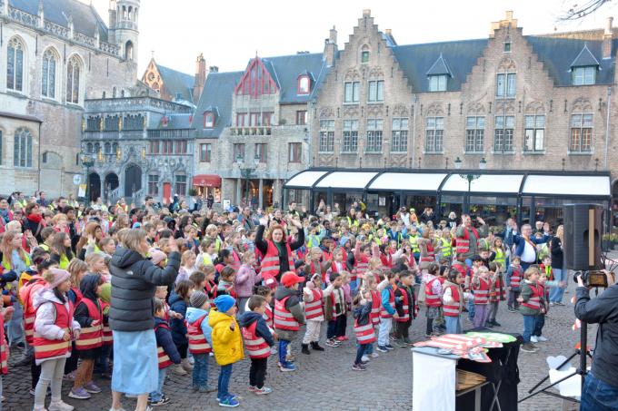 Meer dan 250 kinderen uit Brugse basisscholen dansten enthousiast mee op het campagnelied ‘Alle Kleuren’, samen met burgemeester Dirk De fauw (CD&V). Het nummer kreeg onlangs een frisse make-over: 25 jaar na het origineel bracht 11.11.11 een nieuwe versie uit van het iconische K3-lied. (CGRA/foto CGRA)