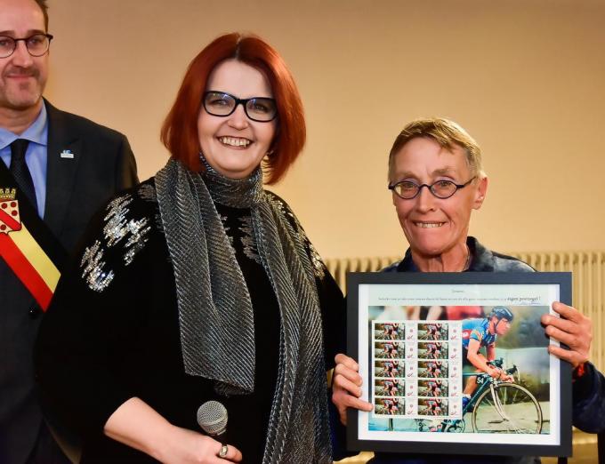 Josiane was meer dan twintig jaar postbode in voornamelijk Geluwe en Wervik. Bpost zorgde voor de tweede verrassing. Senior teamleader Siska Lecompte had voor Josiane een kader mee met daarin haar eigen postzegel. “Ze was een trouwe postbode en net als alle andere grote wielrenners heeft ze nu ook haar eigen postzegel”, liet Siska horen.
