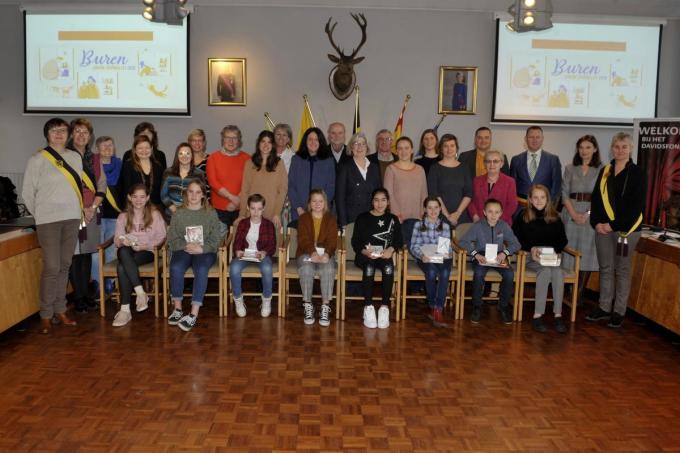 “De titel Ik wou dat ik in een buurland woonde werd ook weinig of niet gekozen door de jeugd. Het is hier dus blijkbaar goed om te wonen.” Annick las van elke laureaat iets voor uit het opstel, waarna Kitana Ferrant – laureate van het zesde leerjaar – en Lotte De Deijne – laureate van het tweede jaar van Prizma Middenschool – zelf hun opstel mochten voorlezen of toch een deeltje eruit. Catherine Callu, voorzitster van het Davidsfonds, riep in alfabetische volgorde de winnaars van elke school naar voor: Matisse Delbeke (De Wingerd), Sirine El Hanafi (Go! Het Wonderbos), Axelle Temmerman (Prizma – De Wegwijzer, Oostrozebekestraat), Lieze Van Boeckel (Prizma – De Wegwijzer, Schoolstraat), Branco Vens (Prizma – Onze-Lieve-Vrouw, 6A), Kitana Ferrant (Prizma – Onze-Lieve-Vrouw, 6B – winnares van de basisscholen), Amelie Bacquaert (Prizma Middenschool, tweede jaar middelbaar) en Lotte De Deijne (Prizma Middenschool, tweede jaar middelbaar). (Patrick D.