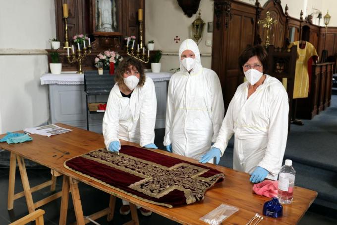 Samen met erfgoeddeskundige Triene Vandenbussche en professioneel textielrestaurateur Shirin Van Eenooghe, is Denise Dewancker, secretaris van de kerkfabriek bezig om de meer dan 150 stuks tellende collectie gewaden in de Sint-Jan-Baptistkerk van Helkijn te ontstoffen en schimmelvrij te maken.