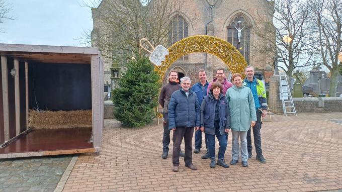 Niet alleen in Lo, ook in Pollinkhove was de plaatselijke feestcommissie druk in de weer met het bouwen van de kerststal. Die heeft de vorm van een kubus, net als de lichten in de bomen. Nieuw dit jaar is de kerstboog aan de ingang van de kerk, een extra eyecatcher voor de nieuwjaarreceptie voor inwoners die op zondag 4 januari in de kerk zal plaatsvinden. Op de foto: van links naar rechts Warre Robbe, Franklin Delanote, Hein Ameloot, Katrien Cailliau, Dries Luyssen, Marieke Samyn en Jan Deheegher. (KVCL/foto KVCL)