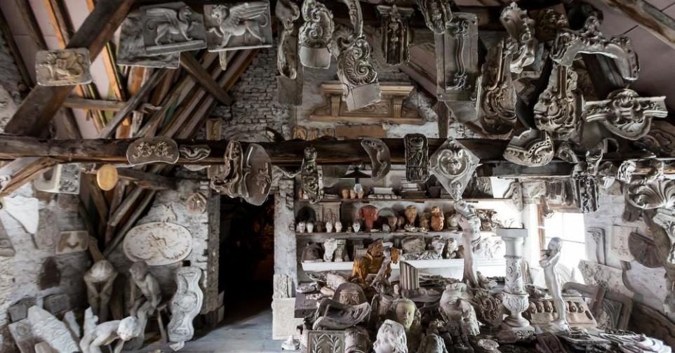 In het oude atelier aan het binnenplein ligt nog een enorm voorraad aan ornamenten en oude plannen. “De grote eerste verdieping van de woning wordt vooral gebruikt als toonzaal voor de sierschouwen en kroonlijsten en de zolderverdieping is eigenlijk een soort schatkamer van wat mijn voorouders hebben gemaakt. Je vindt er zelfs nog een authentiek dodenmasker”, zegt Pol. “Ik gids hier geregeld groepen rond. Maar ik vraag me wel af wat hier allemaal mee moet gebeuren na mijn tijd, want mijn kinderen hebben geen interesse om dit ambacht verder te zetten. Misschien kan de stad Brugge iets doen met de collectie…?”