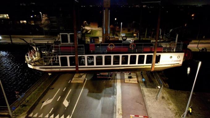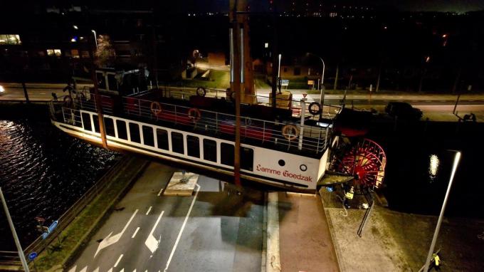 “Dit soort vaartuigen moet wettelijk om de vijf jaar uit het water gehaald worden voor een grote onderhoudsbeurt en keuring”, zei Ludwig Van Spitael van de firma Gardec in Zeebrugge, die de operatie mee begeleidde. “Het over de dam tillen – wat we hier nu zien – is een eerste etappe op weg naar het droogdok in Zeebrugge. Dinsdagavond wordt dan de zogenaamde ‘tafelbrug’ – waarover ter hoogte van de Dampoort de Brugse ringweg R30 loopt – omhoog gedraaid, zodat de boot er onder door kan om dan zo verder richting Zeebrugge te varen.”