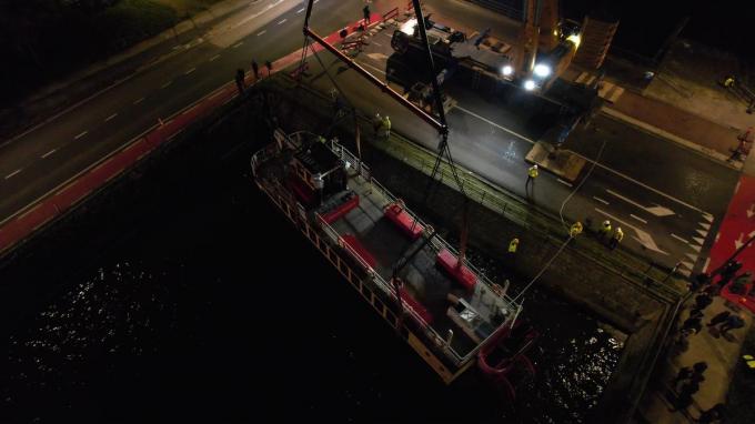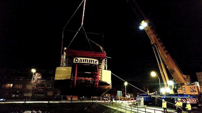 Het was maandagavond omstreeks 22.30 uur bijzonder druk ter hoogte van de aanlegsteiger van plezierboot De Lamme Goedzak aan de Damse Vaart, nabij de Noorweegse Kaai. Enkele tientallen geïnteresseerde buurtbewoners, medewerkers en sympathisanten van de rederij wilden dan ook volgen hoe het vaartuig van 35 ton met een uit de kluiten gewassen kraan over de dam tussen de Damse Vaart en de Noorweegse Kaai gehesen werd. Die klus, waarbij stevige linten met staaldraad in verweven, omheen de boot werden gelegd, verliep zonder incidenten. Al was het toch even de adem inhouden toen het gevaarte net niet tegen een lantaarnpaal botste tijdens zijn ‘zweeftocht’. De boot is sinds enkele jaren eigendom van de bekende ondernemer Luc Beke, die de operatie ook kwam volgen.