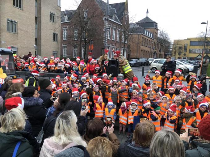 De stedelijke basisschool Mariaschool trok met alle klassen naar de Nieuwe Markt in Harelbeke om er kerstliederen te zingen. Dit onder leiding van de leerkrachten en de directeur.