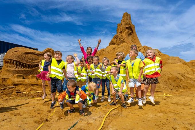 Vrijdagnamiddag mochten de kleuters van de basisschool ‘De Zandloper’ als eersten een blik werpen op de gigantische dinosaurussen van het zandsculpturenfestival in Middelkerke en als kers op de taart mochten ze ook meespelen in een promotiefilmpje voor de VRT.