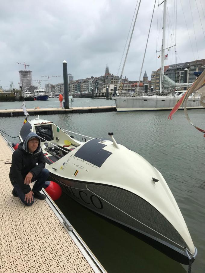 Het is toch verrassend om tussen de zeegaande trafiek van vissersschepen, zeil- en motorjachten, crew transfer vessels, installatieschepen, zandzuigers, overzetboten… een volwassen roeiboot buitengaats te zien riemen. “Daarvoor hebben we speciaal toestemming gevraagd en gekregen van de havenkapitein”, zegt de uit Gent afkomstige bouwer en eigenaar van deze boot-op-spierkracht Koen De Gezelle.
