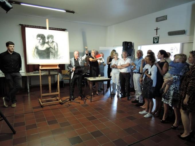 Nog geen twee uur na afscheid met woorddienst in de kerk van Maria Assumpta, waar Robert De Man ooit als jonge twintiger de kruisweg ontwierp, opende Johan Kiggen in zaal Zuidleie de veiling van 9 werken die de kunstenaar schonk aan ‘Kom op tegen Kanker’.