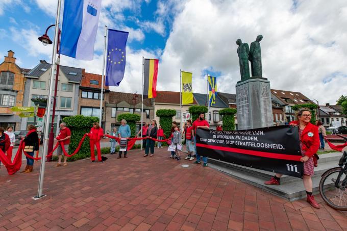 De actievoerders trokken dan ook een symbolische rode lijn aan het vredesmonument aan de kerk. Vooraf vroegen ze op om in rode kledij naar de demonstratie te komen, een oproep die niet in dovemansoren viel. Enkele tientallen actievoerders tekenden present.
