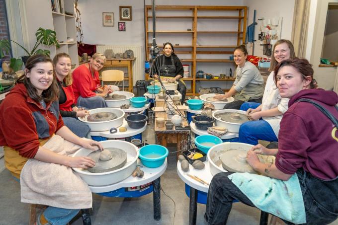 “Er staan zes draaischijven en een boetseerbank voor je klaar waar je op je eigen tempo kan experimenteren. Er zijn persoonlijke workshops, groepsworkshops en workshops op maat. Soms komen er ook externe gastdocenten langs. Keramiek is ook het ideale teambuildingevent. Draai je zelf thuis, maar heb je geen oven? Dan kan je bij ons terecht om je werk te bakken, biscuit en glazuurbak.”
