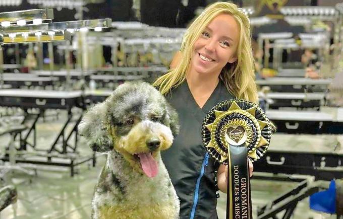 “Met Rocco de bernedoodle (kruising tussen een berner sennen en een koningspoedel, red.) deed ik op vrijdag mee in de categorie doodles. Hier behaalde ik de eerste plaats. Dit is niet mijn eigen hond, maar van een van mijn lieve klanten”, glundert Melanie. “Vorig jaar behaalde ik bij de beginners nipt niet het podium. Ik volgde nog tal van workshops in binnen- en buitenland. Ik specialiseerde mij in het knippen van een zo mooi mogelijk ‘beertje’. Ik had nooit verwacht dat ik zou winnen wegens de enorme concurrentie, maar blijkbaar hebben al die bijscholingen hun effect niet gemist. Dit is mijn eerste podium én meteen de eerste plaats.”
