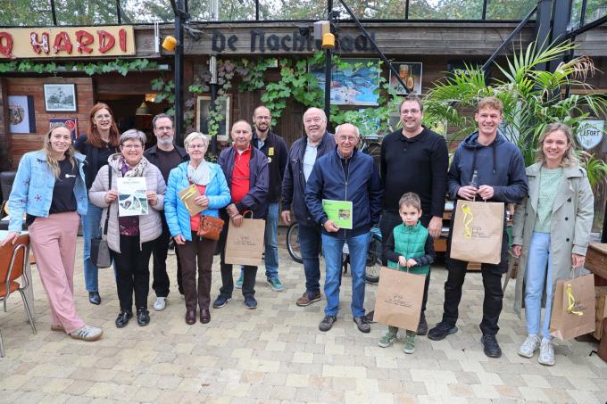 De winnaars van de grensoverschrijdende fiets- en kinderzoektocht werden ontvangen in De Nachtegaal in Westouter. De zoektocht was een gezamenlijk initiatief van de toeristische dienst van Heuvelland en Coeur De Flandre. Er werden ruim 170 formulieren ingediend. De hoofdprijs van de fietszoektocht, een verblijfsarrangement aangeboden door Coeur De Flandres, werd gewonnen door Melissa Wittebol uit Nazareth. De tweede prijs ging naar Mathilde Thery uit Steenwerck en de derde prijs naar Kenny Blomme uit Eernegem. Raphael Tessier uit Belle, Emma George uit Saint-Omer-Capelle, Delphine Deltombe uit Ieper, Thijs Merlevede uit Loker en Ina Jennerich uit Passendale kregen een streekmand. We zien de winnaars omringd door de organisatoren. (EF/foto EF)