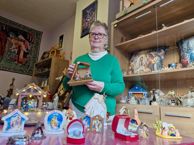 Wie door de Guido Gezellestraat in Oostnieuwkerke wandelt, kan er moeilijk naast kijken. Beide ramen van het rijhuis van Monique doen namelijk dienst als etalages voor haar kerststalletjes. “Al twintig jaar verzamel ik ze. Mijn zoon koopt soms eens eentje op een rommelmarkt voor me, terwijl de kleinkinderen vaak iets meebrengen als ze op reis zijn gegaan. Ik heb ooit zelfs eens een zoekertje in de krant gezet. Ik heb er uit onder meer Canada, Rwanda, Sicilië, Oeganda, Spanje, Noorwegen, Finland, Kroatië, Mallorca, Ecuador en Lourdes. Vorig jaar had ik nog maar 150, maar veel mensen in het dorp weten dat ik ze verzamel en het voorbije jaar heb ik er een flink pak bijgekregen. Af en toe koop ik ook zelf eentje. Al moet ik daarmee opletten, want dan laat ik me soms eens wat gaan. Nu al heb ik er een tiental die ik niet uitgehaald heb, omdat ik geen plaats meer heb.”