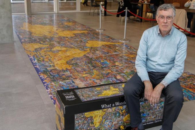 De grootste puzzel ter wereld is te bewonderen in de cafetaria van wzc Meunyckenhof. Jacky Rosseel (72) stelt er zijn indrukwekkende puzzel What a Wonderful World tentoon. Een puzzel van 60.000 stukjes. “De doos, met een gewicht van maar liefst 61 kilo kon ik niet alleen dragen, daarvoor had ik helpende handen nodig.”