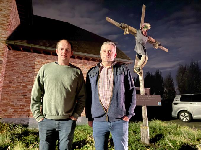 “Deze beslissing hadden we helemaal niet verwacht”, bekent Ruben Huyghe (36). Zijn gekruisigde heks kijkt naar drie windturbines die elke seconde rood oplichten. Ze werden enkele jaren geleden gebouwd na een procedureslag bij Geluwe aan de Beselaarse grens. “Deze liggen verder en zijn kleiner dan de turbine die nu wordt vergund. Ik woon op amper 300 meter. De windmolens komen alsmaar dichterbij.”