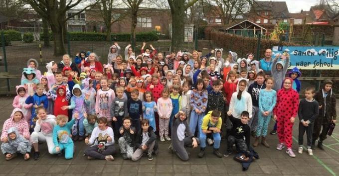 140 kinderen en 20 leerkrachten kwamen in pyjama naar school om speciaal te denken aan kinderen en jongeren die langdurig ziek zijn. De kinderen vonden het zichtbaar leuk en mochten vlak voor de middag ook nog genieten van een pyjamafuif op de speelplaats.