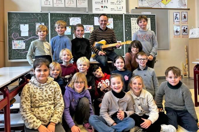 De apotheose volgde vlak voor het laatste belsignaal. Muzikant Annemans bracht veel liedjes in de klas. Al zijn jonge en oude leerlingen kennen nog steeds de hele tekst van de Samsonrock. “Dat heb ik nog een laatste keer luidkeels met alle kinderen gezongen. En voor de gelegenheid had ik mijn elektrische gitaar mee, in plaats van de akoestische. Het was een bijzonder mooi moment.”