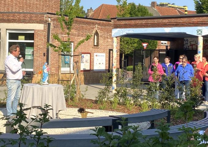 De speelplaats van vbs Spes Nostra in de Schoolstraat in Heule zit in een nieuw, helemaal vergroend jasje. Dinsdagavond werd ze officieel ingezegend samen met een aloud Mariabeeld in een muurkapelletje. “En dat beeld is voor ons niet zomaar decoratie, maar toont de waarden waar wij als school voor staan”, zei directeur Daan Terryn op een plechtigheid waar ook vele oud-personeelsleden een kijkje kwamen nemen.
