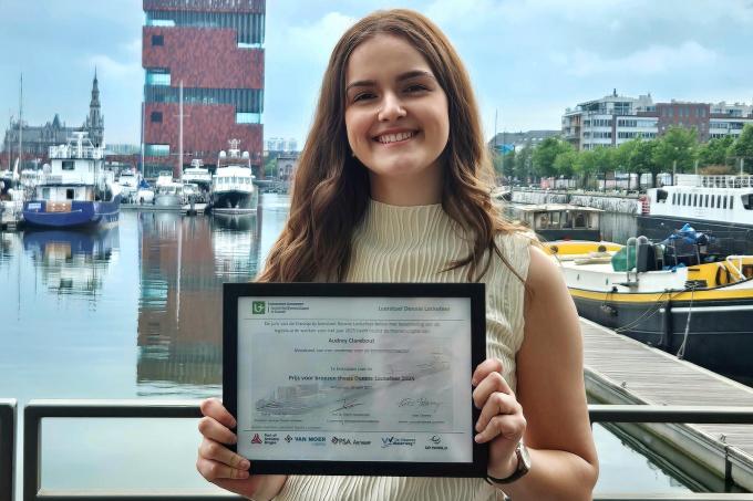 Audrey Clarebout (25) uit Klerken heeft de bronzen prijs gewonnen voor haar masterproef aan de Universiteit Antwerpen. In haar thesis ontwikkelde ze een roadmap voor de binnenvaartsector waarin ze obstakels blootlegt en aanbevelingen doet voor de toekomst. De prijs werd uitgereikt tijdens de jaarlijkse thesisprijsuitreiking van de Leerstoel Dennie Lockefeer.