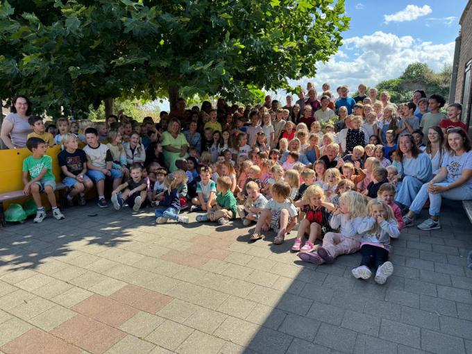 Dubbel feest in basisschool De Notelaar op 1 september. De 160 leerlingen vierden niet alleen de start van het schooljaar maar ook het jubileum van de directeur van de school. Hilde Landuyt is al twintig jaar het hoofd van de gemeenteschool en daarom werd ze in de bloemetjes gezet. Hilde kent de school uit Oedelem door en door aangezien ze er ook als kind al heel vaak kwam.