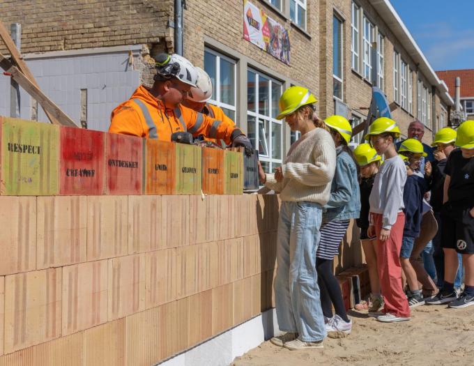 Tijdens de eerstesteenlegging metselden de kinderen symbolisch de eerste stenen van de bouwwerken. “Stenen waarop niet alleen de datum en onze visie staat, maar ook alle namen van de kinderen. Bij een volgende afbraak zal men de woorden die onze visie weergeven –zoals ‘respect’ en ‘creatief’ – en alle namen terug ontdekken. Diezelfde woorden zullen ook in stapstenen voor de nieuwe ingang van de school worden ingewerkt. Tegen 1 september 2024 zouden we de nieuwe gebouwen in gebruik kunnen nemen”, aldus het directieteam. (Daron Mertens)