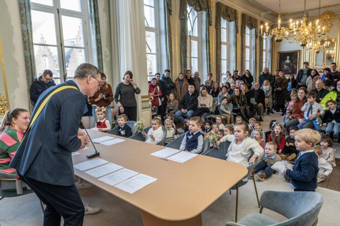 Twee oldtimerbussen voerden de kleuters naar het stadhuis. Daar wachtte schepen van burgerlijke stand Stefaan Van Coillie (CD&V) de kleuters op. “De voorbije maanden hebben we rond het thema ‘vriendschap’ gewerkt. Zo leerden we de knuffeldans. De kleuters zijn goed voorbereid op vandaag”, aldus de juf. Van trouwmuziek, tot bloemen en natuurlijk ook de trouwringen. Alles was piekfijn geregeld in aanloop naar het dubbel huwelijk. “De ouders zorgden ervoor dat alle kleuters er piekfijn uitzien.”