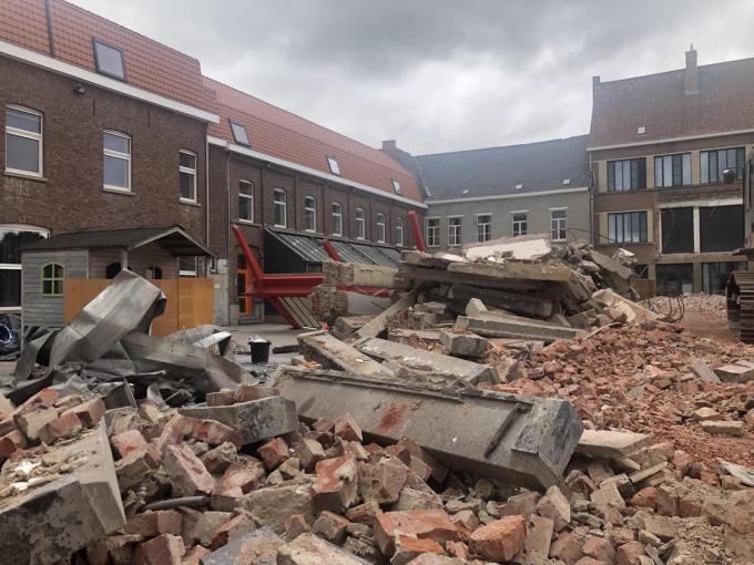 Het bouwvallig gebouw achteraan in de kleuterschool van De Graankorrel in de Grauwe Zusterstraat in Wervik is afgebroken. Grondwerken Deprez is sinds eind vorige week in verlof. In de Speiestraat is doorgaand verkeer weer mogelijk.