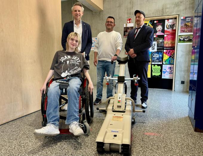 “Vooral de bereikbaarheid van onze turnzaal in de kelder van de gebouwen in de Arsenaalstraat is problematisch voor leerlingen met een beperkte mobiliteit, maar nu is dit probleem eindelijk van de baan”, vertelt directeur Jo Decoster. “Het heeft even geduurd voor de aankoop van het toestel helemaal rond was, maar we zijn blij dat we nu over die trappenklimmer beschikken. Als school hebben we een voorbeeldfunctie en moeten we ons blijvend inzetten voor inclusief en toegankelijk onderwijs. We gaan er prat op dat we een inclusieve school zijn en dan is zo’n trappenklimmer een must. Ik ben vooral heel blij voor Lena dat ze nu eindelijk kan deelnemen aan de lessen lichamelijke opvoeding.” Lena Verslijpe (16) uit Brugge, leerling van het vijfde jaar woordkunst en drama, is sinds haar geboorte mindervalide en is uiteraard opgetogen met de aankoop van de trappenklimmer. “Eigenlijk kan ik me vrij vlot verplaatsen naar alle leslokalen, want er is een lift en mijn vrienden helpen me graag wanneer ik een zware deur niet openkrijg. Alleen de toegankelijkheid van de gymzaal was een probleem. De school heeft samen met mijn ondersteuner gezocht naar een oplossing en die is er nu.”