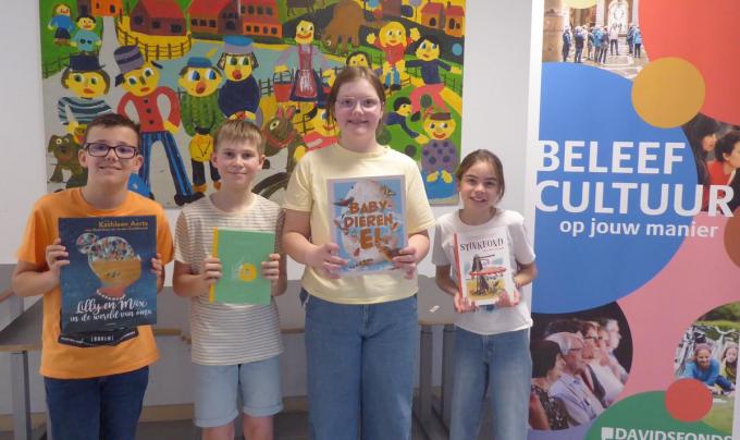 De leerlingen uit de vlinderklas en de zwaluwklas deden mee aan het schrijven van een verhaal rond het thema Feest. Laureaten uit de vlinderklas waren Alies Hellebouts en Sean Duflouc. De laureaten uit de zwaluwklas waren Thorben Steen en Dieuwke Beernaert. Ze mochten hartelijke felicitaties ontvangen uit handen van het Davidsfonds Gits. (EVG/foto EVG)