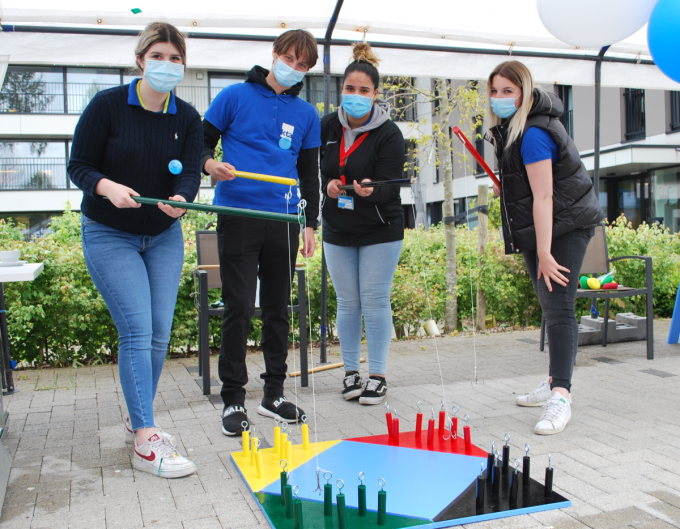 Verschillende afdelingen (Hout, Schilderen, Metaal, Bouw…) werkten mee aan de realisatie van spellen als Rad van Fortuin, Memory, golfbanen, ringwerpen…