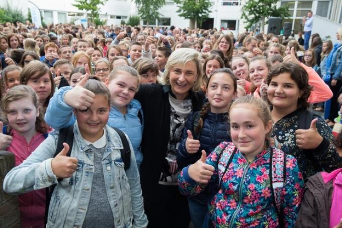 Na het gesprek en een bezoekje aan de school sloeg de minister nog een praatje met de leerkrachten en vooral veel leerlingen. Met het luiden van de bel trok Crevits het nieuwe schooljaar onder veel gejoel op gang.