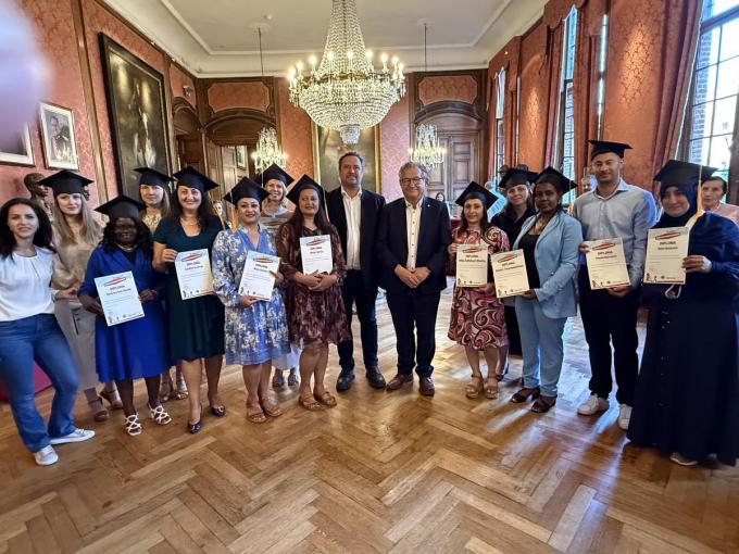Recent ontvingen dertien afgestudeerde onderwijsambassadeurs tijdens een feestelijk afstudeermoment in het stadhuis uit handen van burgemeester Dirk De fauw en schepen van sociale zaken Pablo Annys hun diploma.