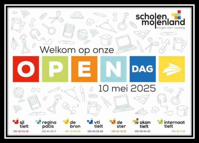 De scholen De Bron, De Ster, Regina Pacis, het SJI én het VTI zijn alle vijf geopend tussen 14 en 18 uur. Ook het internaat van Scholen Molenland houdt een open dag. Op alle locaties kunnen (potentiële) nieuwe leerlingen en hun ouders een woordje uitleg krijgen over het studieaanbod en kan er al eens van de sfeer geproefd worden. De scholengroep Molenland staat in voor het katholiek secundair onderwijs in Tielt, telt 3.000 leerlingen en stelt ongeveer 450 personeelsleden tewerk. (SV)
