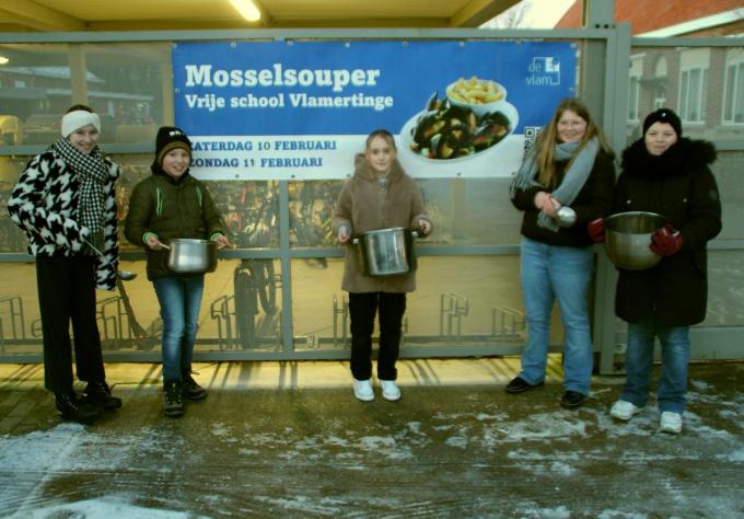 Op zaterdag 10 en zondag 11 februari wordt traditiegetrouw het jaarlijkse mosselsouper georganiseerd in de Vrije School De Vlam in Vlamertinge. Al 53 jaar worden onafgebroken in de school tijdens het eerste weekend van de krokusvakantie mosselen à volonté met frietjes (23 euro) of vol-au-vent met groentjes en friet à volonté (20 euro) geserveerd. Voor het eerst dit jaar kan er ook groenteburger (20 euro) verkregen worden. Er is ook een aangepast kindermenu (20 euro). Inschrijven kan tot en met dinsdag 6 februari. Op de foto staan Garmyn, Vinnie Maelstaf, Linde Thoré, Kato Denuwelaere en Elodie Vanysacker. (EG/foto EG)