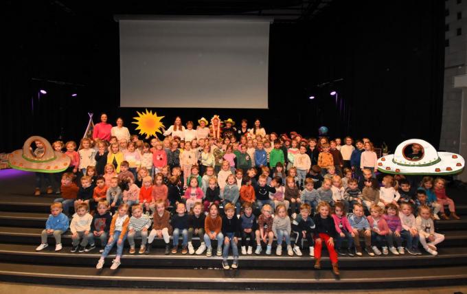 Iedereen kreeg na afloop dan ook een welverdiend applaus. Op de foto zien we de kleuters van de Beselaarse school samen met de kleuterleidsters Stéphanie, Laura, Alanis, Fabiana, Sylvianne, Leen, Charlot en Griet.