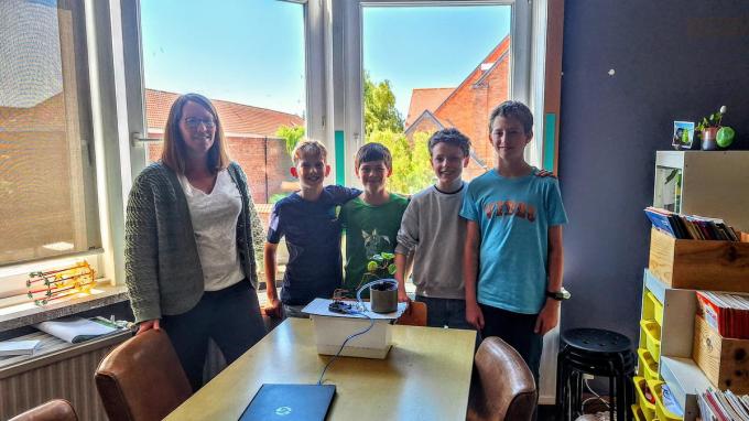 Hun project kreeg de naam #Plantastic, en dat was het ook. Sam Van Hulle (12), Senne Louwye (12), Andres Claesen (11) en Karel Buyens (11) bouwden een automatisch bewateringssysteem dat met behulp van een vochtigheidssensor en een Arduino-microcontroller zelf in de gaten houdt wanneer een plant dorst heeft. Wordt de grond te droog, dan stuurt het systeem automatisch een signaal naar een pompje dat net genoeg water toedient. “De plant van onze juf zag er na de vakantie echt triest uit”, vertelt Sam. “Daarom wilden we iets maken dat planten ook in de vakantie goed verzorgt.”