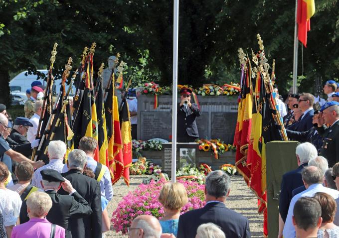 Na de kerkdienst volgde een bloemenhulde aan het monument. Er waren ruim 30 vaandeldragers van vaderlandslievende verenigingen uit het hele land, aanwezig. Verder waren er ook een 20-tal instanties of personen die een bloemstuk aan het monument legden. De plechtigheid verliep in aanwezigheid van militair commandant Isabelle Lahaye en een delegatie van de militaire logistieke school uit Doornik en gebeurde in het decor van enkele jeeps van de organisatie ‘Remember Belgium’. De herdenking werd opgeluisterd door Kon. Harmonie De Verenigde Vrienden uit Sint-Denijs. (GJZ/foto GJZ)