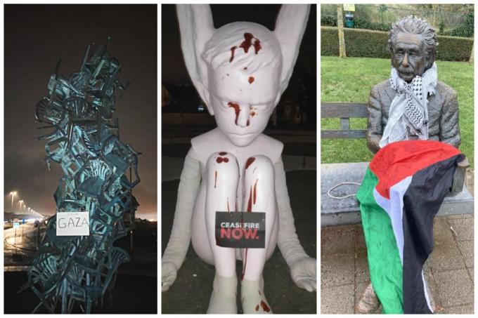 De actiegroep liet ook een Palestijnse vlag achter bij het standbeeld van Einstein in De Haan, en bekladde het beeld ‘Benjamin’ van de vorige Beaufort-editie met rode verf en de boodschap ‘ceasefire now’ – ‘staakt het vuren nu’.
