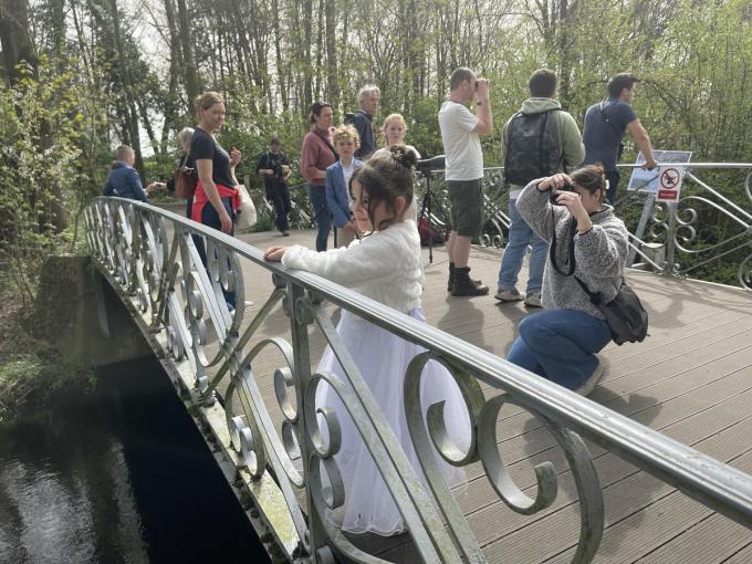 Het romantische boogbrugje bij het kasteel van De Blankaart was afgelopen weekend misschien wel het drukst bezochte brugje van het land. Tal van ‘vogeltoeristen’ wilden van het mooie weer profiteren om een glimp op te vangen van de broedende zeearenden. Tussen de dure kijkers van de vogelspotters doken ook fototoestellen op, die zich richtten op netjes aangeklede communicanten. “Zeg eens zeearend”, grapte een fotografe tijdens het kiekje van ‘haar’ communicant op het brugje aan de kant van het beroemde roofvogelnest.