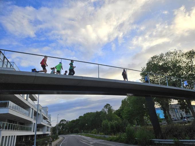 Als iedereen netjes over de fietsbrug rijdt of wandelt en niet afdaalt (naast de brug) naar de gemaaide groenzone, loopt niemand gevaar. Alle 1.100 deelnemers aan “Laat mie moar lopen” volgden mooi het bochtige brugtraject van het Suikerpark naar de Sasstraat. Voor velen de eerste keer dat ze via deze brug het kanaal overstaken. Ik was er ooggetuige van: geen enkele loper zocht naar doornappels.