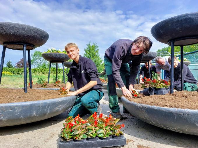 Ralf Vanlerberghe (16) en Bavo Maetens (16) zijn leerlingen aan de Tuinbouwschool. “Ik vind dat wel rustgevend, zo bloemen planten. Ik kom dan tot mezelf. Ik zou graag later in tuinonderhoud en tuinaanleg werken en dan nog een cursus boomchirurg volgen als ik afgestudeerd ben. Ik hou er echt van om buiten te zijn en om die droom te volgen,” zegt Ralf.