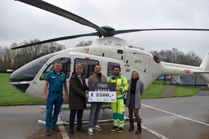 Op de helilandplaats van het AZ Sint-Jan ontving spoedarts Emmanuel De Tandt, ook secretaris van het Instituut voor Medische Dringende Hulpverlening en verantwoordelijke voor het beheer van de MUG Heli, een cheque van 3.500 euro van de organisatoren van One Night Clips The Reunion. De fuif, die in oktober plaatsvond in de Oostcampus in Oostkamp, bracht de mooie som bijeen.