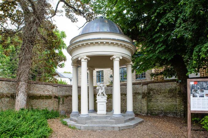“We zijn trots op ons patrimonium en dragen er goed zorg voor”, aldus schepen van Patrimoniumbeheer Minou Esquenet. “Met de restauratie van het paviljoen willen we dit architectonisch pareltje beschermen en bewaren voor de toekomst. Het uitgangspunt van de restauratie was het maximale behoud van het neoclassicistisch gebouwtje in zijn oorspronkelijke toestand.” Het prieeltje bevindt zich in een tuin die in de 18de-19de eeuw behoorde bij het woonhuis dat we nu kennen als het Arentshuis. Pas vanaf 1911 werd de tuin publiek domein. Al in de 18de eeuw is er sprake van een gloriette in de tuin. Het bestaat uit een sokkel van blauwstenen treden met daarop zes ionische zuilen die een zware kroonlijst en het met lood afgedekte koepeldak schragen. Centraal in het gebouwtje staan twee vechtende putti uitgebeeld. Het is een kopie – in 1972 gemaakt door beeldhouwer Standaert – van het originele beeld van 1781 dat door de Brugse beeldhouwer Pieter Pepers werd gebeeldhouwd. Het originele beeld behoort tot de collectie van de Brugse musea. De restauratie startte in mei 2021. Voor de start van de werken werd een kleuronderzoek uitgevoerd zodat het paviljoentje in zijn oorspronkelijke kleuren kon worden geschilderd. De restauratie bestond uit een reiniging, herstelling van het voegwerk en restauratie van de natuursteenelementen en het metsel- en pleisterwerk.