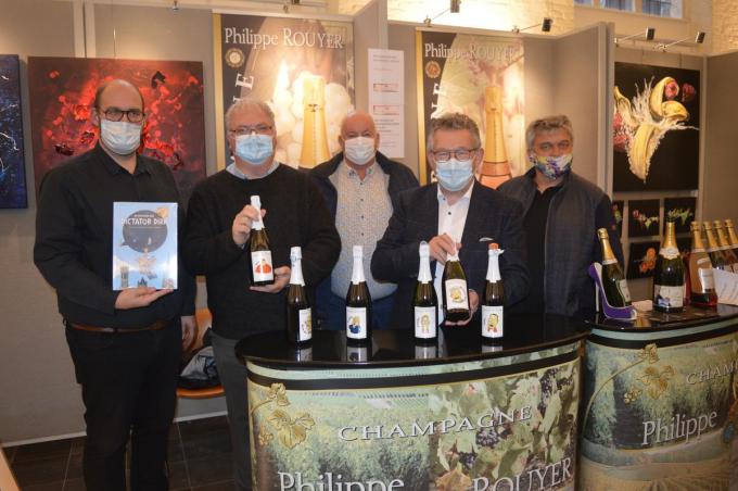 Maar er is meer: de hoofdpersonages uit Dictator Dirk zijn nu ook te zien op een beperkt aantal champagneflessen. Het gaat om een initiatief van Bruggeling Jan Bisschop, de voorzitter van Chambrugge, de Brugse club voor champagneliefhebbers.