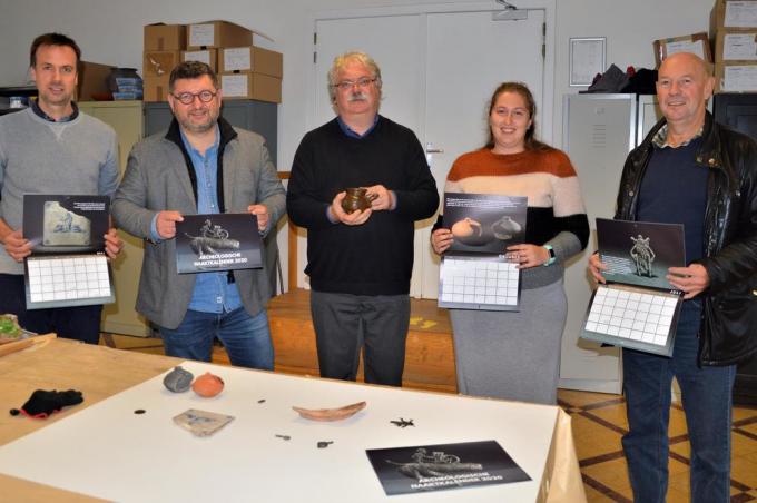 Schepen Nico Blontrock en Pascal Ennaert, voorzitter van Raakvlak, kochten maandag de eerste twee exemplaren van de naaktkalender 2020 die de archeologische dienst in het kader van de Warmste Week aan de man en vrouw brengt. “Een absolute must-have voor de erfgoedliefhebber, en een ideaal cadeautje voor onder de kerstboom”, aldus Caroline Landsheere van Raakvlak.