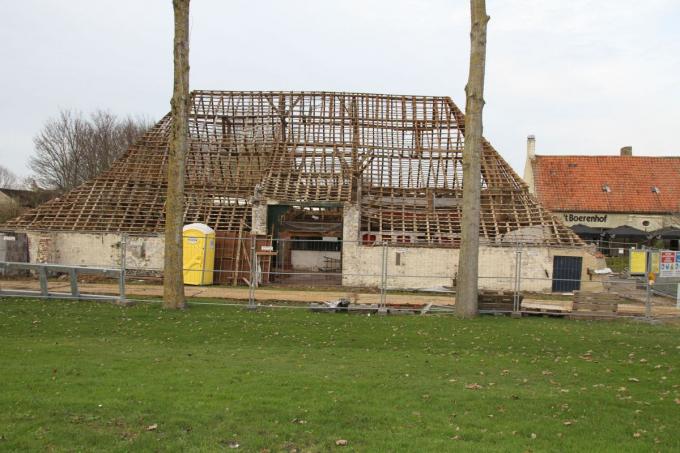 Na vele jaren van leegstand wordt de waardevolle bergschuur nu casco gerestaureerd. De bakstenen muren en het indrukwekkende dakgebinte worden gestabiliseerd. Er wordt dakisolatie geplaatst en het dak van pannen en riet wordt vernieuwd. Enkele bestaande poortopeningen worden voorzien van vensters maar met behoud van de poorten. (MM)