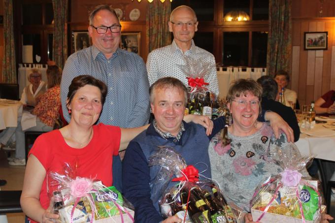 Kaartclub De Grenskloppers reikte de prijzen uit. Ronny Derycke en Evelien Broucke zijn seizoenskampioen geworden. Patriek Delerue en Veronique Nollée werden dan weer koning en koningin. Veronique nam ook de rode lantaarn mee naar huis. We zien zittend Evelien Broucke, Ronny Derycke en Veronique Nollée. Achteraan staan secretaris Dirk Vandewalle en voorzitter Patriek Delerue. De vereniging telt 23 leden en het clublokaal is café De Vette Os in Leisele. (foto AB)