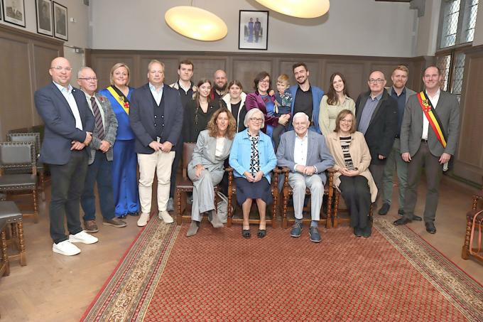 Naar aanleiding van hun briljanten jubileum werden Romain De Prest en Rosina Braet in het gemeentehuis in de bloemetjes gezet. In 1958 leerden ze elkaar kennen in de danstent van Suzanne Van Hulle. Op 27 oktober 1960 stapten ze in het huwelijk. Eerst woonden ze in Knesselare, maar algauw vonden ze hun stek langs de Oude Staatsbaan in Adegem. Rosine werkte bij Philips en bleef daarna thuis om voor de kinderen te zorgen. Romain werkte eerst op de boerderij van zijn vader, ging daarna op ‘travaux’ en werkte bij Philips. Hun liefde werd bekroond met 2 dochters, 4 kleinkinderen en 1 achterkleinkind. Momenteel is er een tweede achterkleinkind op komst. (MIWI/foto MIWI)